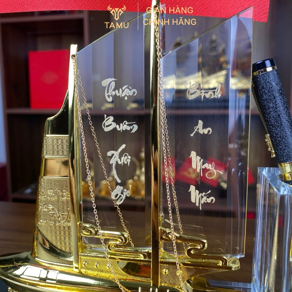 Chi tiết mô hình: Thuyền buồm vàng nổi bật – được khắc các câu chữ phong thủy như: “Thuận Buồm Xuôi Gió”, “Bình An May Mắn”