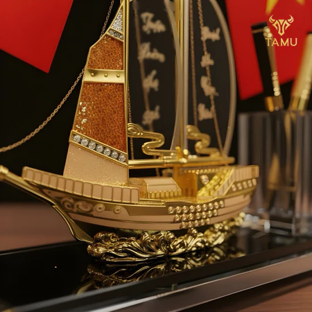 Chi tiết mô hình: Thuyền buồm vàng nổi bật – được khắc các câu chữ phong thủy như: “Thuận Buồm Xuôi Gió”, “Bình An May Mắn”